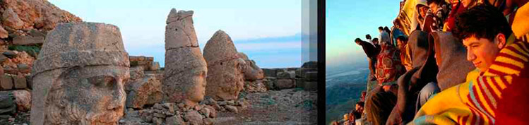 Mount Nemrut is at an altitude of 2,150 m (7,053 ft) from the sea level, and the tumulus which includes the tomb of the King of Commagene, Antiochos Epiphanes the I. is there. Mithradates the I., father of Antiochos to whom the tumulus belongs, took advantage of defenselessness of the Seleukos who ruled in Syria after Alexander’s death, and founded the independent kingdom of Commagene in the year 80 B.C. Mithradates the I. was succeeded by his son Antiochos the I. (62-32 B.C.) who brought great fame to his country. The King who pointed out in his inscriptions that his maternal lineage had been traced back to Alexander the Great, and his paternal lineage to the Persians, joined the two cultures for this reason. Mithradates the II. was enthroned after him, and he was succeeded by Antiochos the III, during whose reign the country became powerful. After his death, Vespasianus united Commagene to the province of Syria (72 A.D.)The tumulus is at a distance of 65 km (40 miles) to the township of Kahta in Adiyaman; the tomb is placed in the middle of the tumulus and is covered by a small hill which has a height and diameter of 50 m (164 ft) and 150 m (492 ft) respectively and made of small pieces of stones. Terraces are built on the four sides of the tumulus. There is an altar in the eastern terrace and there are also statues arranged in a line, with their backs turned to the tumulus. The heads of the statues have rolled down to the terrace in front, but the bodies still stand erect.