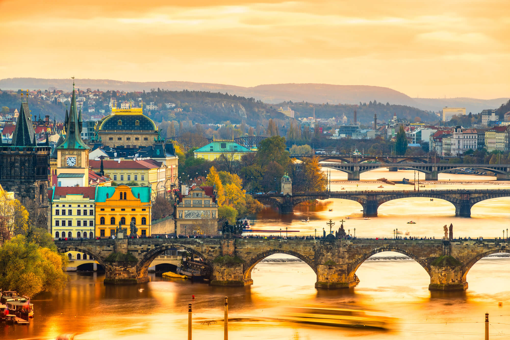 Prague city panorama at sunset, high resolution image, Czech Republic.