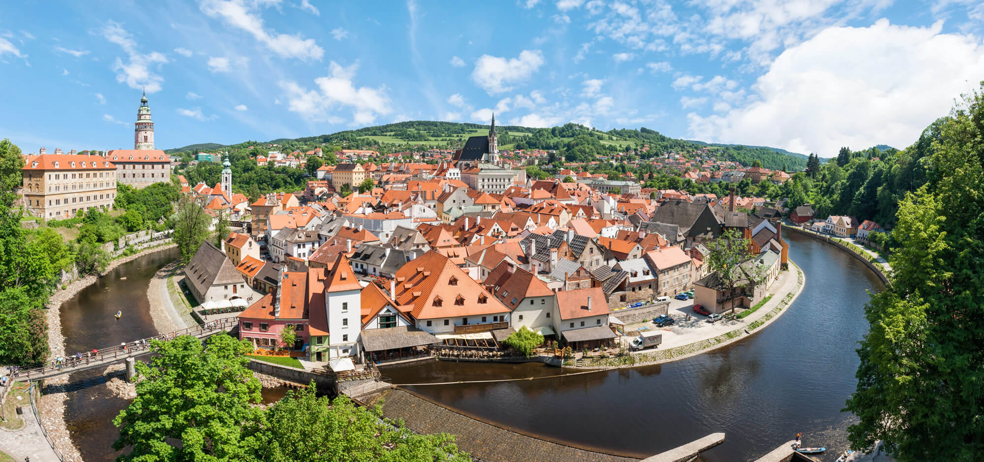 Panorama of the historical part of Cesky Krumlov with Castle and Church of St. Vitius, Czech Republic.