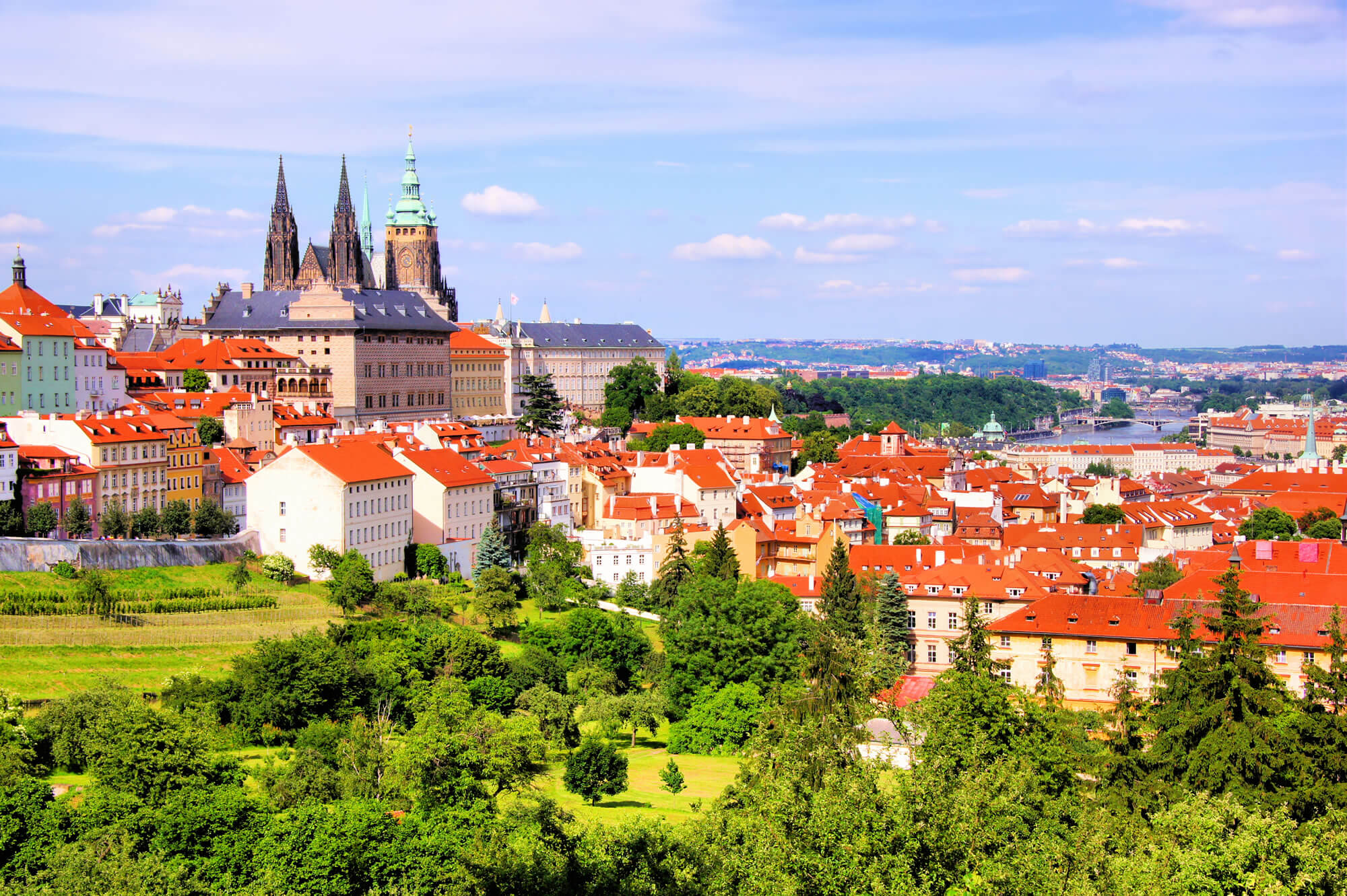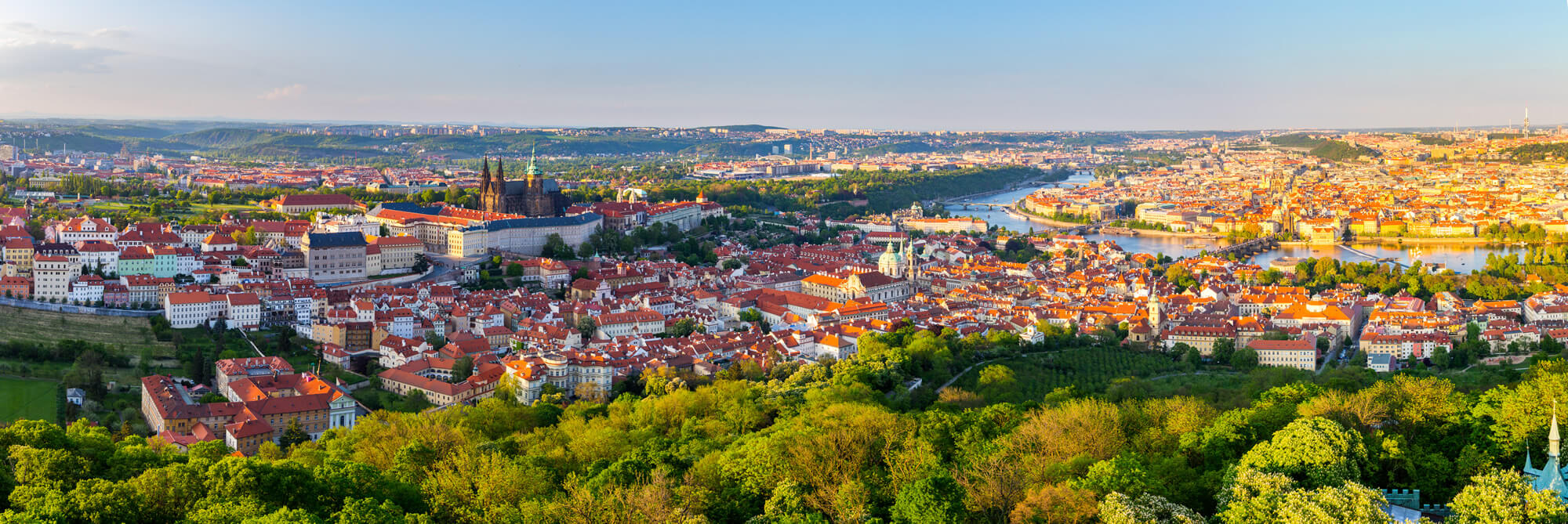 Panorama of Prague with red roofs from above summer day at dusk, Czech Republic.