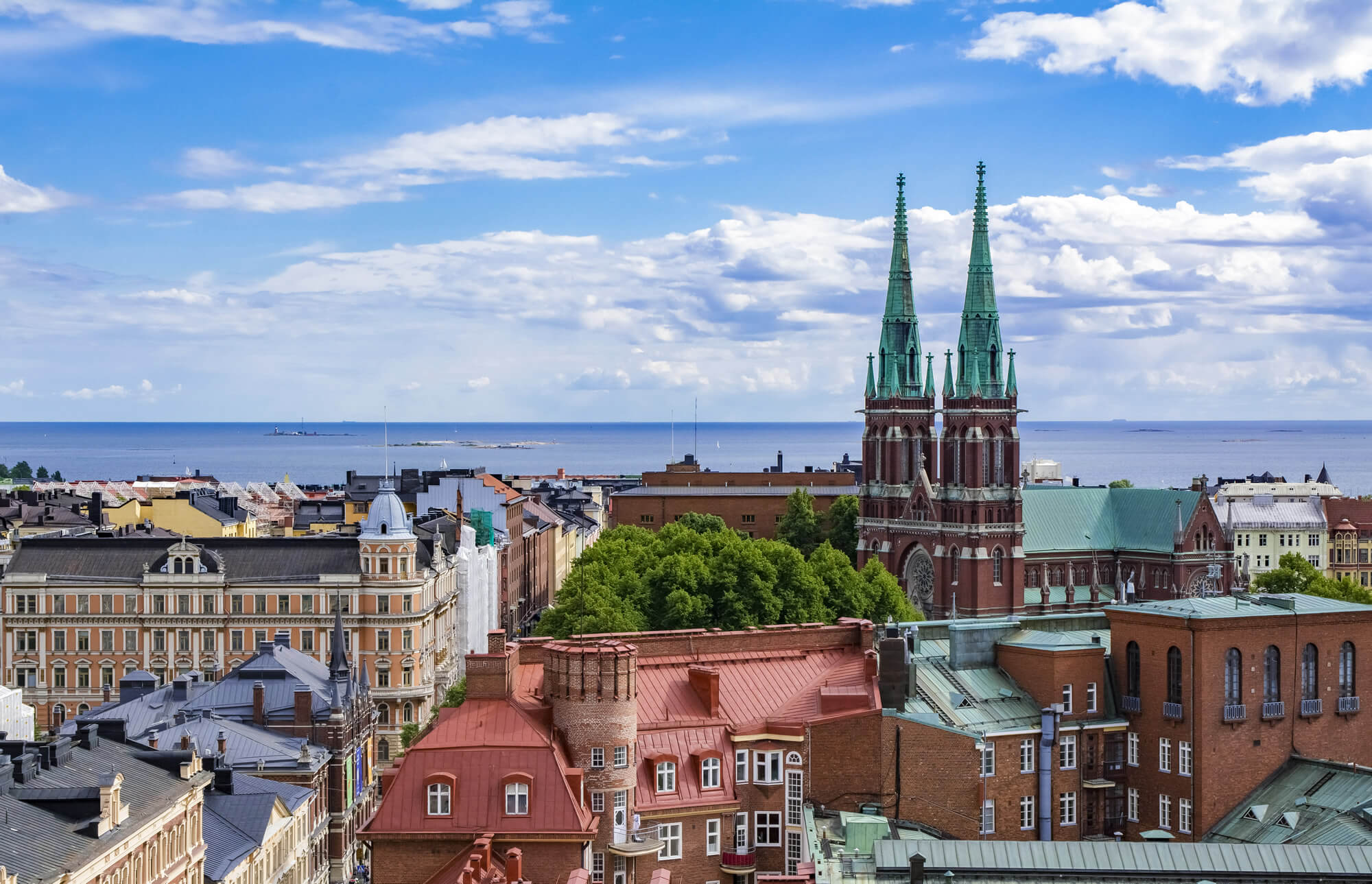 Scenic summer aerial panorama of the Old Town architecture in Helsinki, Finland