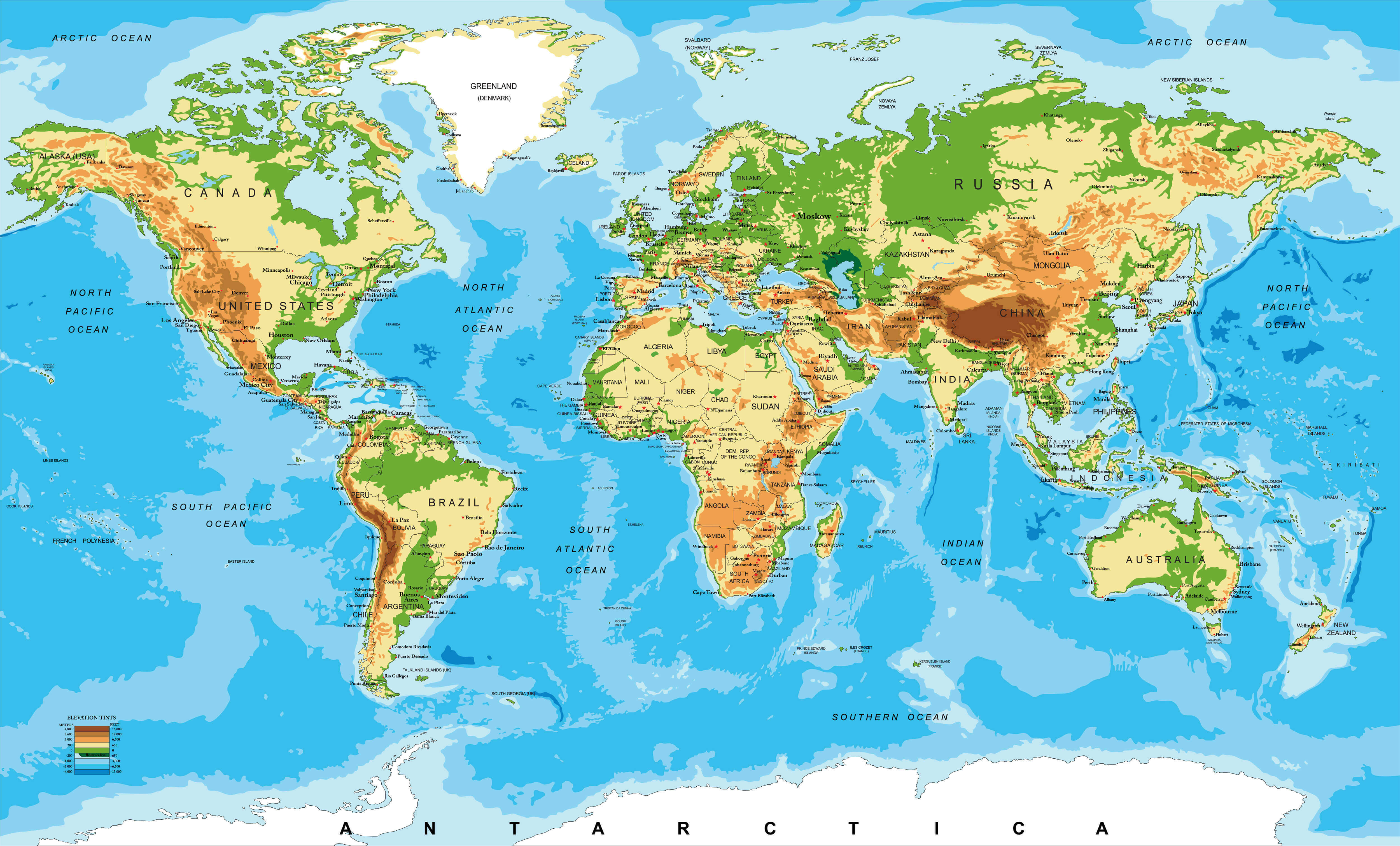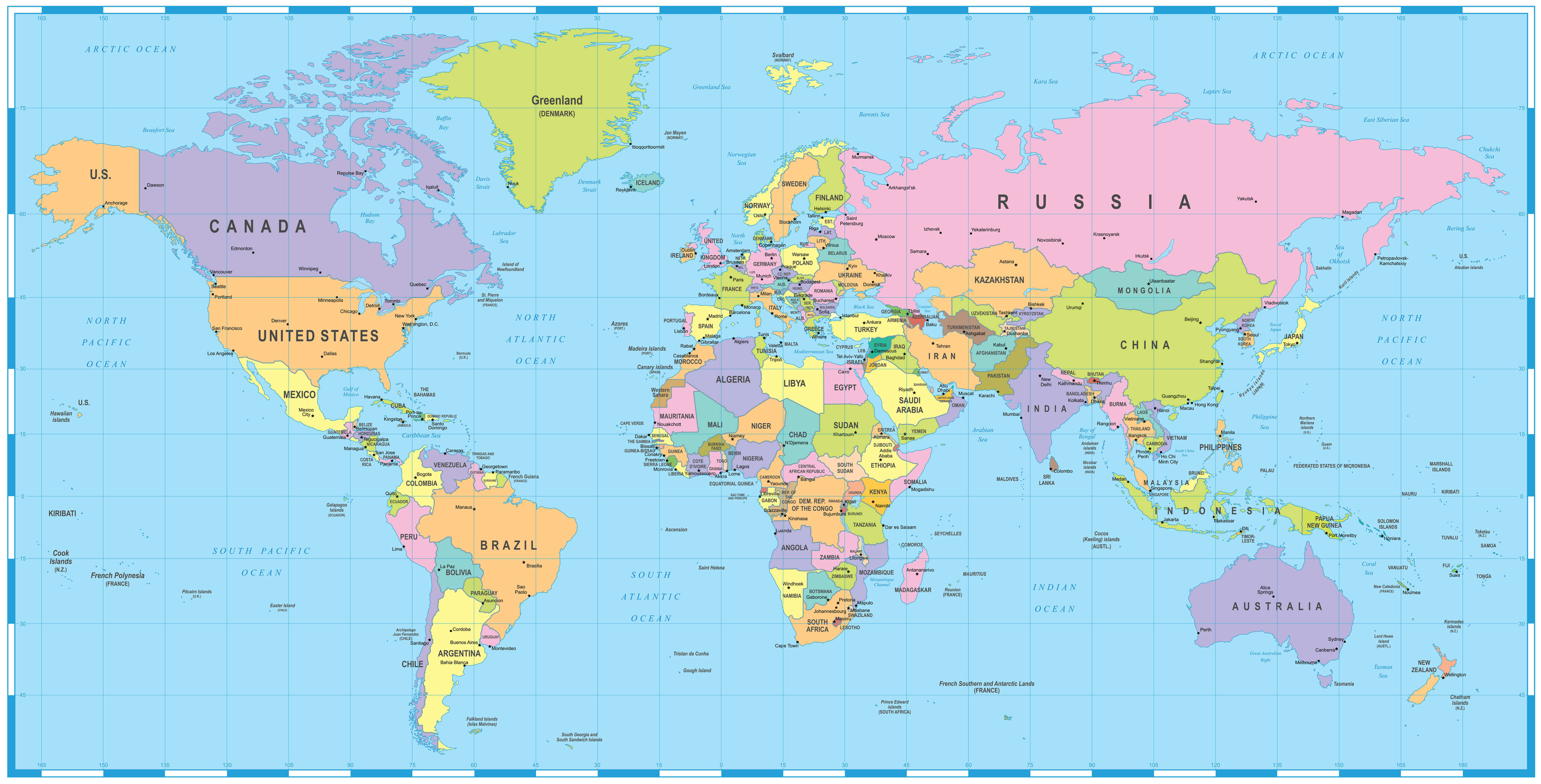 Colored World Map - borders, countries and cities - illustration Image contains next layers: - land contours - country and land names - city names - water object names