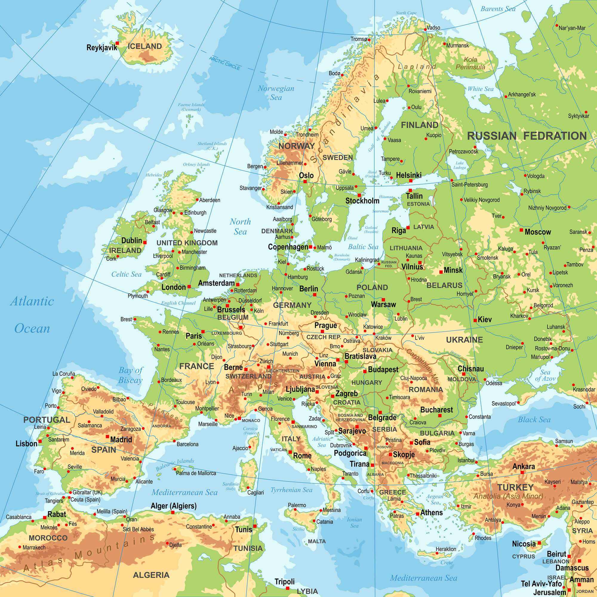 Highly detailed colored vector illustration of Europe map - borders, countries and cities - illustration.
