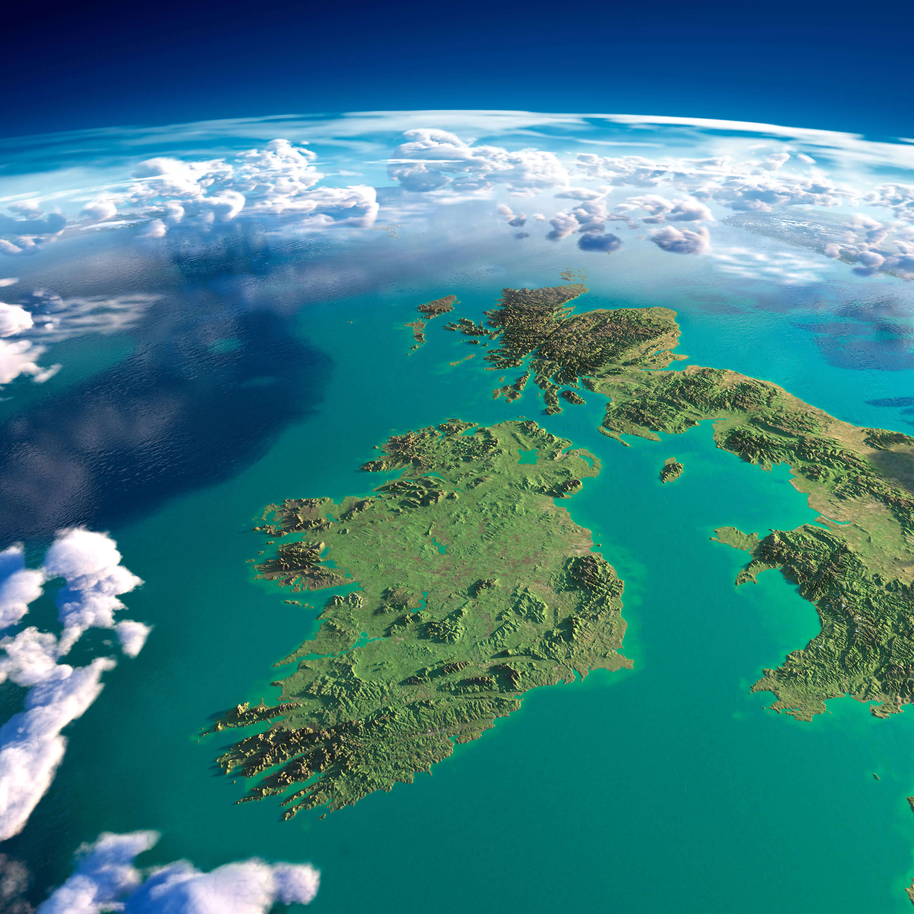 Highly detailed Ireland and UK Map with fragments of the planet Earth with exaggerated relief, translucent ocean and clouds, illuminated by the morning sun.