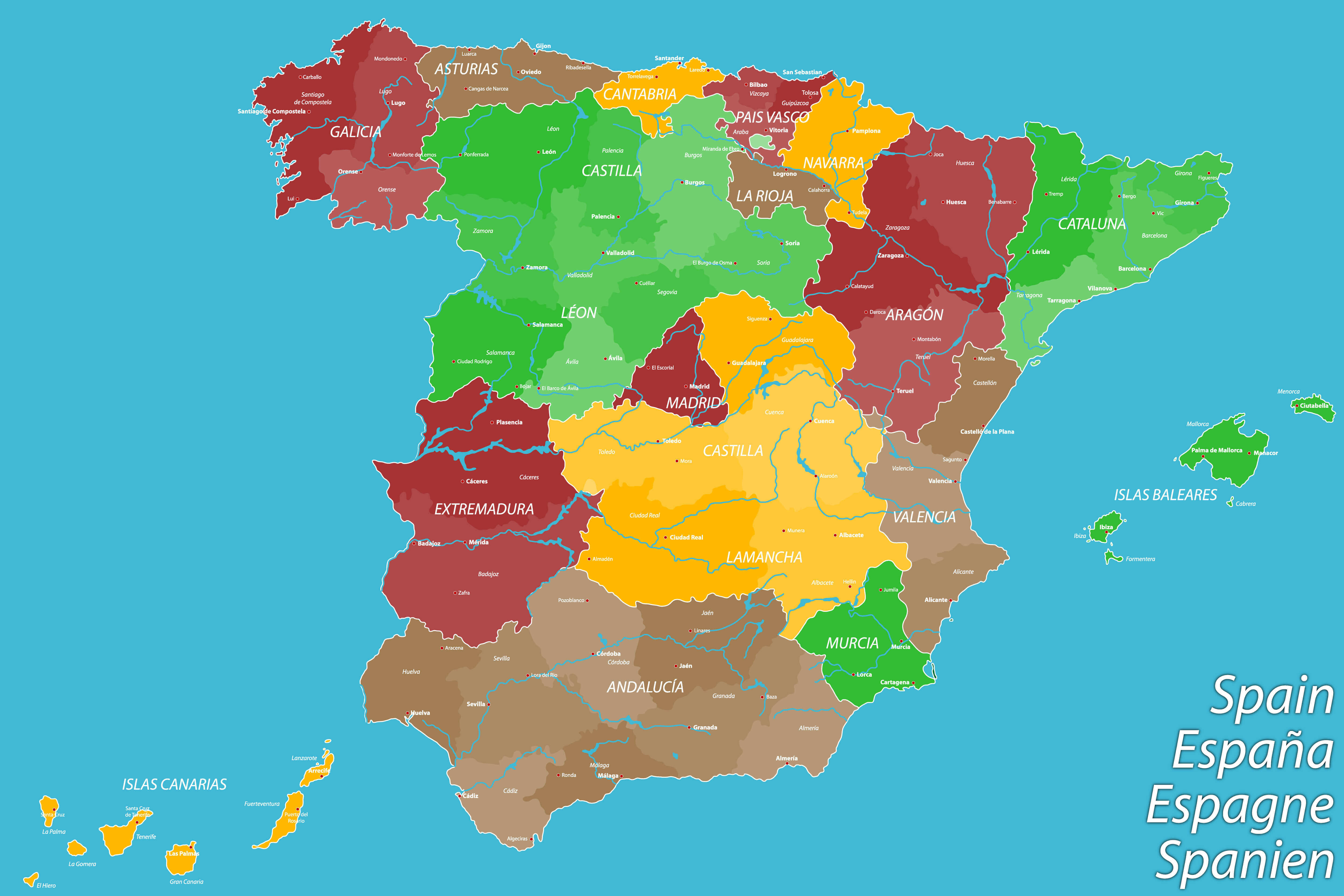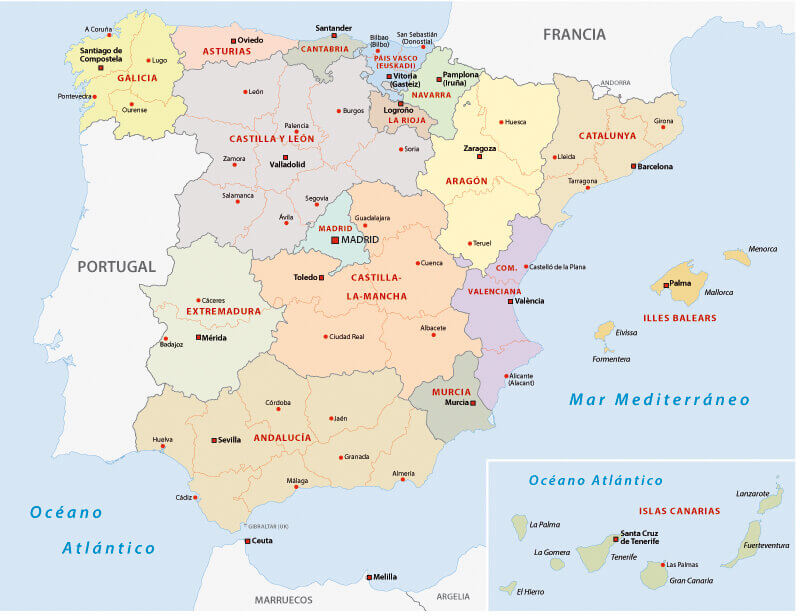 Spain Political Map with capital Madrid, national borders, most important cities, rivers and lakes.