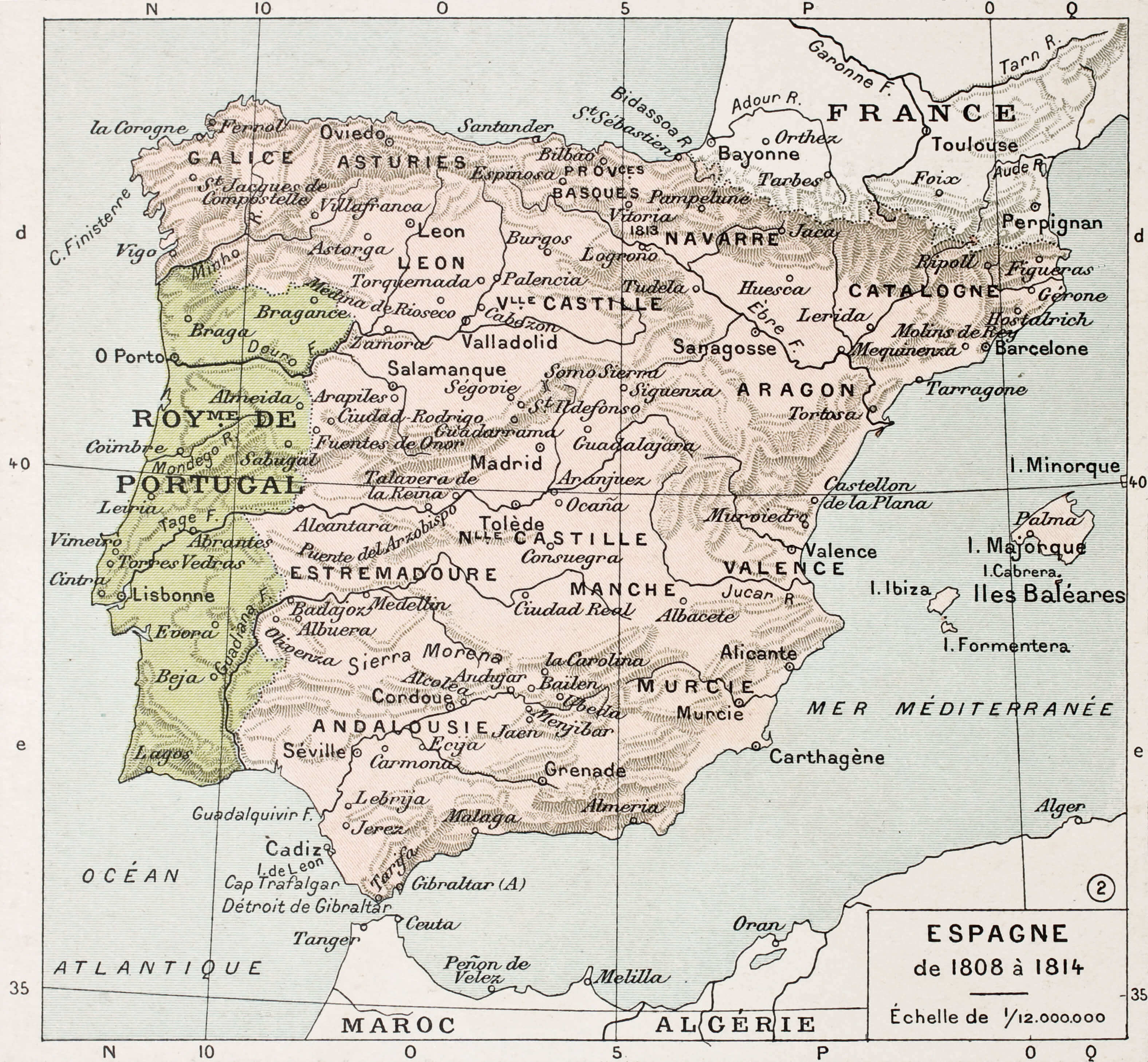 Spain between 1808 and 1814 old map. By Paul Vidal de Lablache, Atlas Classique, Librerie Colin, Paris, 1894