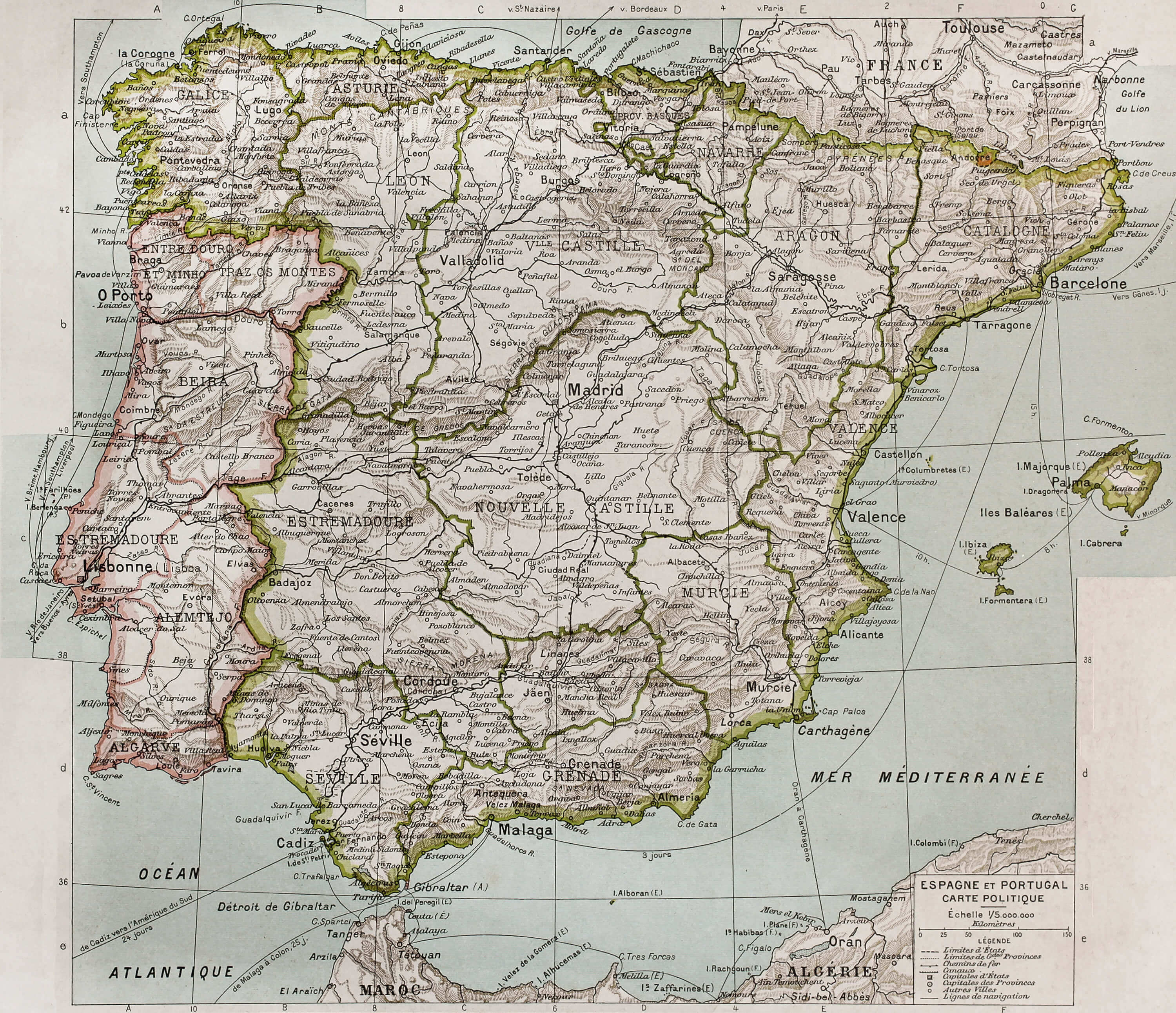 Spain and Portugal political map. By Paul Vidal de Lablache, Atlas Classique, Librerie Colin, Paris, 1894 (first edition).