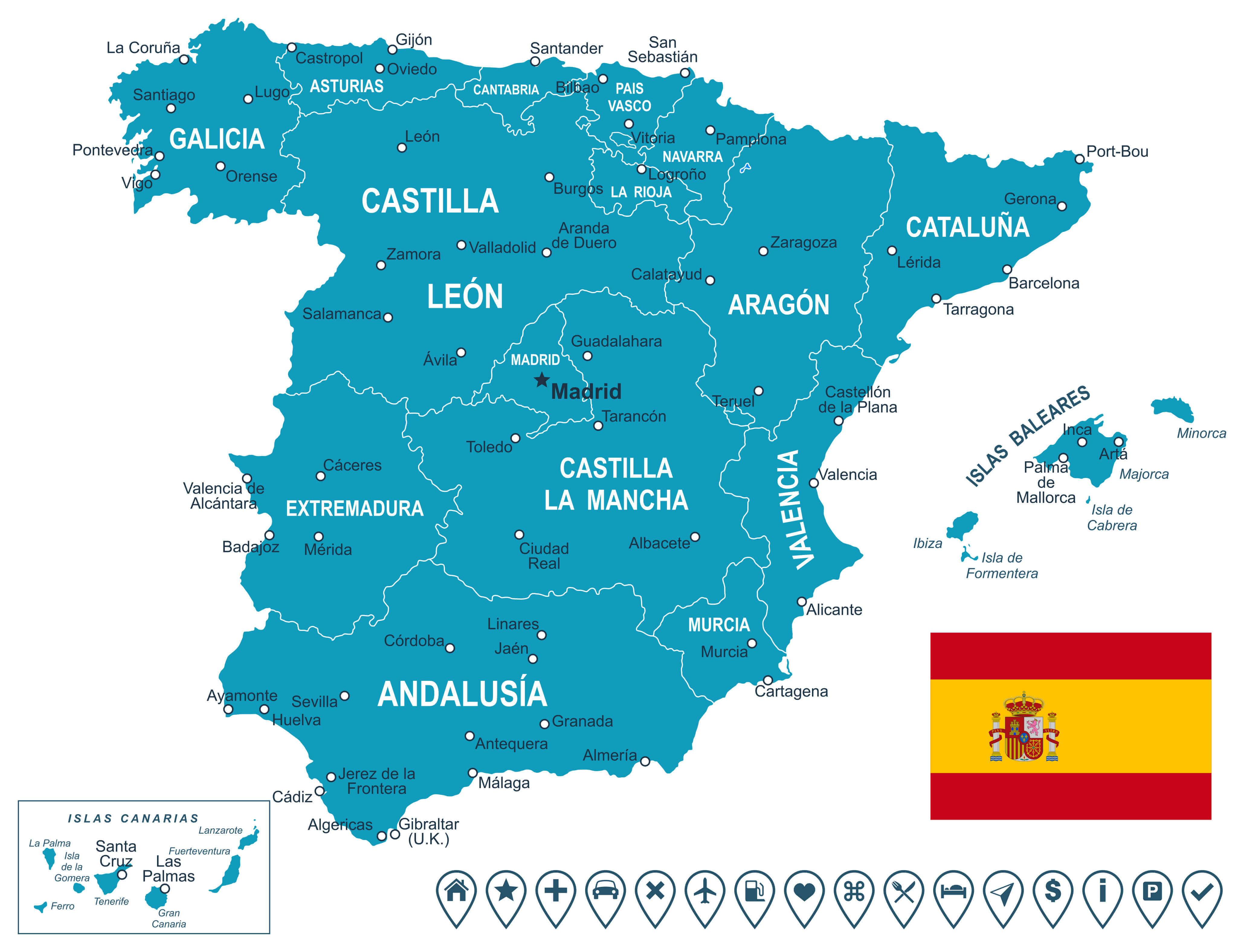 Road map of Spain with highways, railroads, cities, rivers and navigation icons/Road map of Spain.