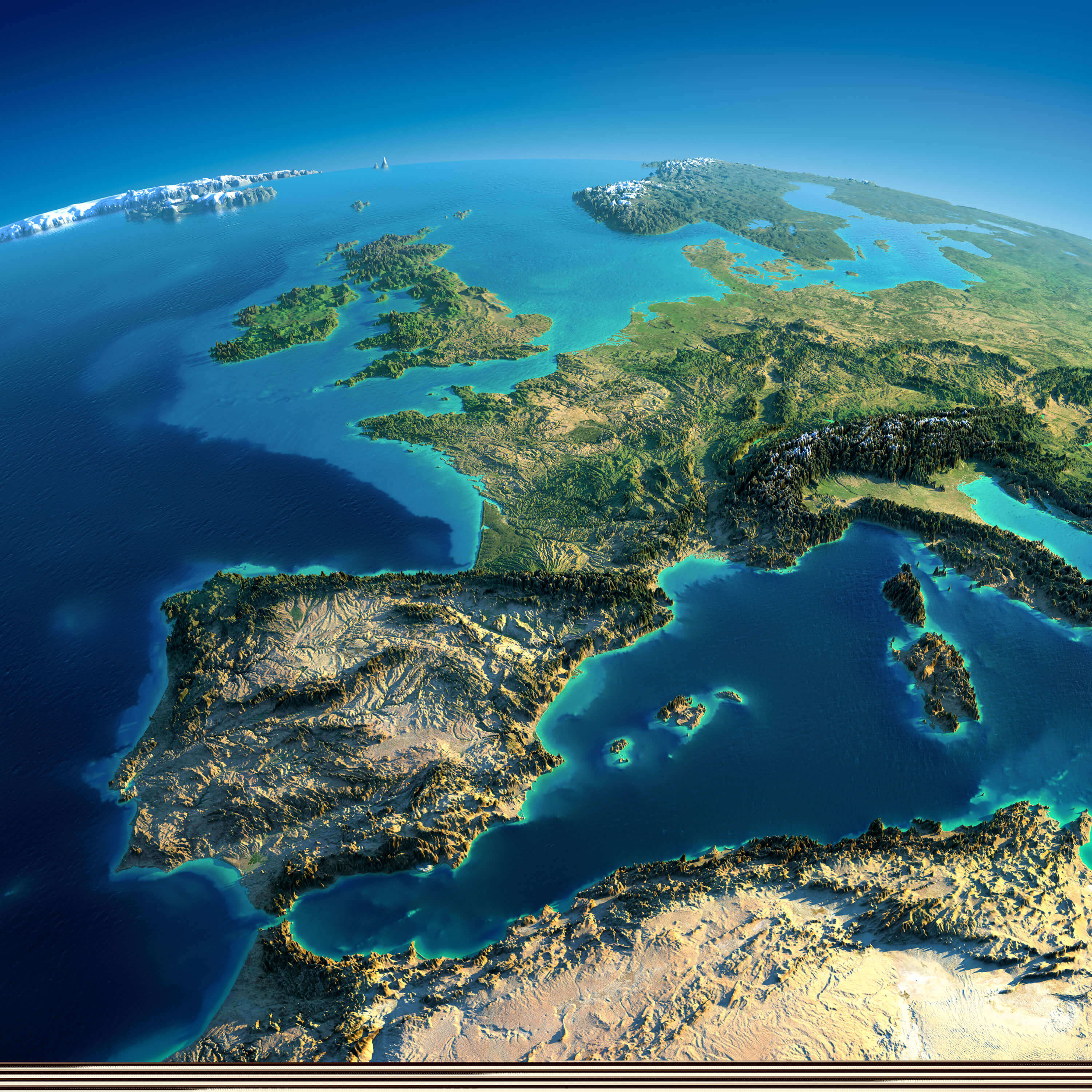 Highly detailed planet Earth. Exaggerated precise relief is illuminated by the rising sun from the east. Part of Europe, Spain, the Mediterranean Sea.