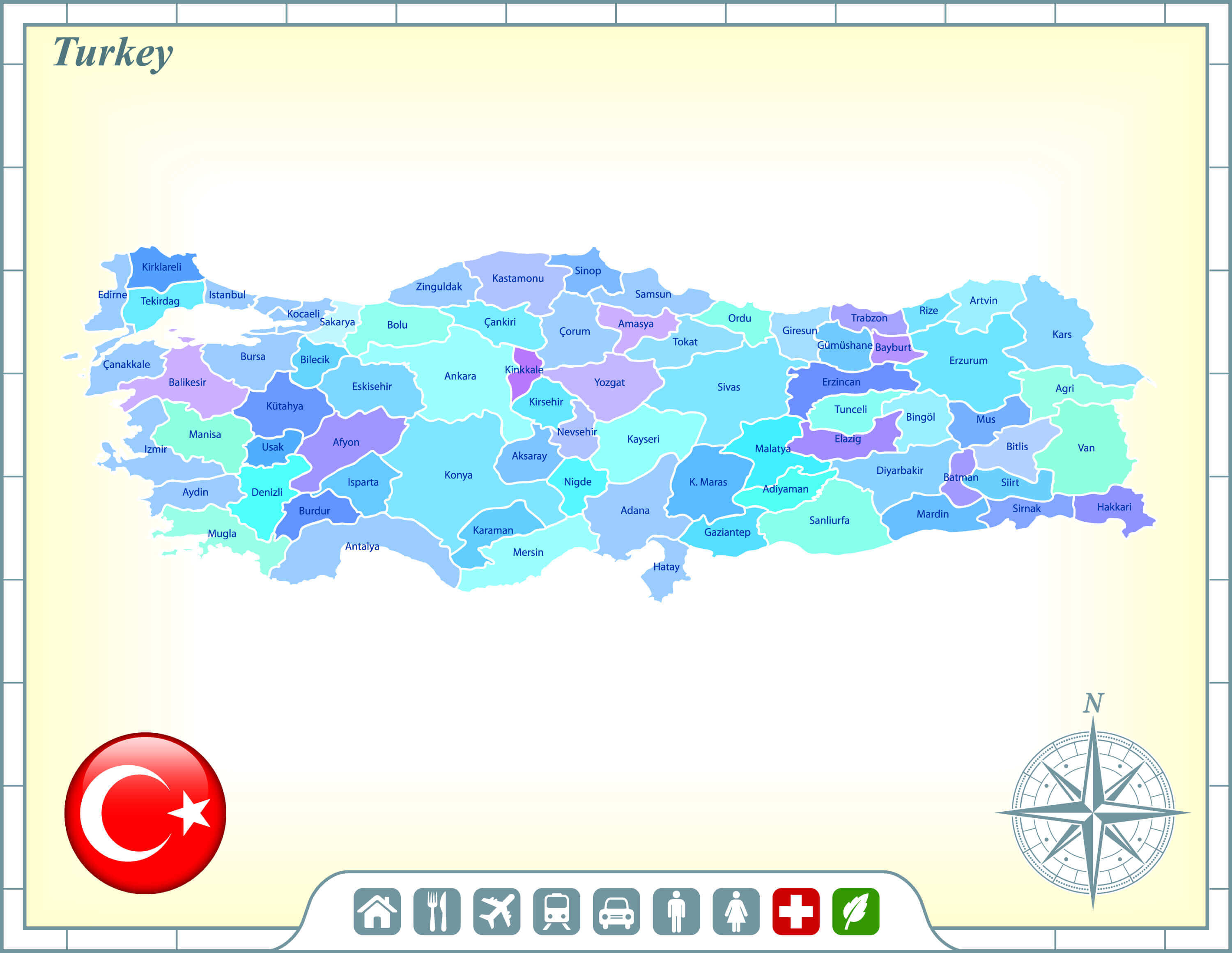 Turkey Map with Flag Buttons and Assistance & Activates Icons Original Illustration.
