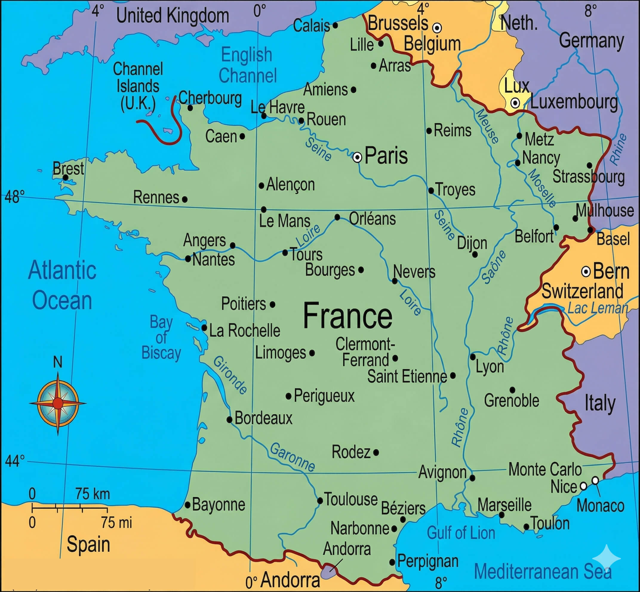 FRANCE POLITICAL MAP WITH CITIES AND RIVERS