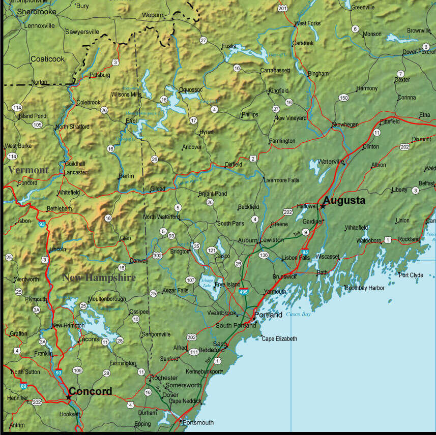 turkey-visit.com offers a collection of Maine map, google map, Maine atlas, political, physical, satellite view, country infos, cities map and more map of Maine.