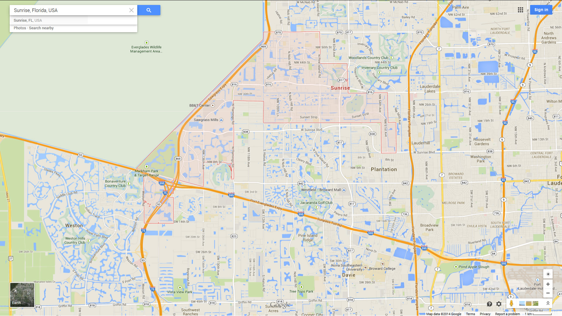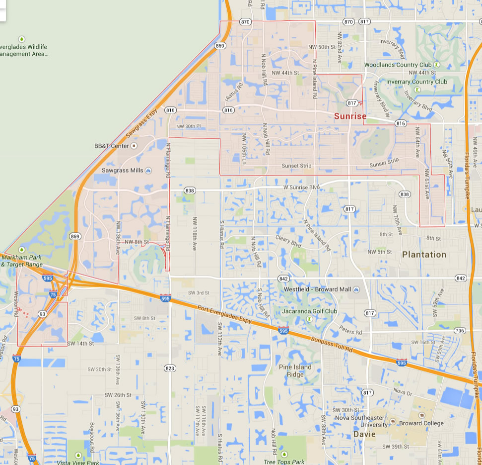 Navigate Sunrise, Florida Map, map of Sunrise, Sunrise Florida regions map, Sunrise satellite image, towns map, road map of Sunrise.