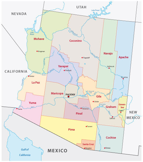 Map of Arizona state designed in illustration with the counties and the county seats.