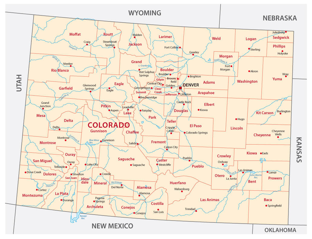 Map of Colorado state designed in illustration with the counties and the county seats.