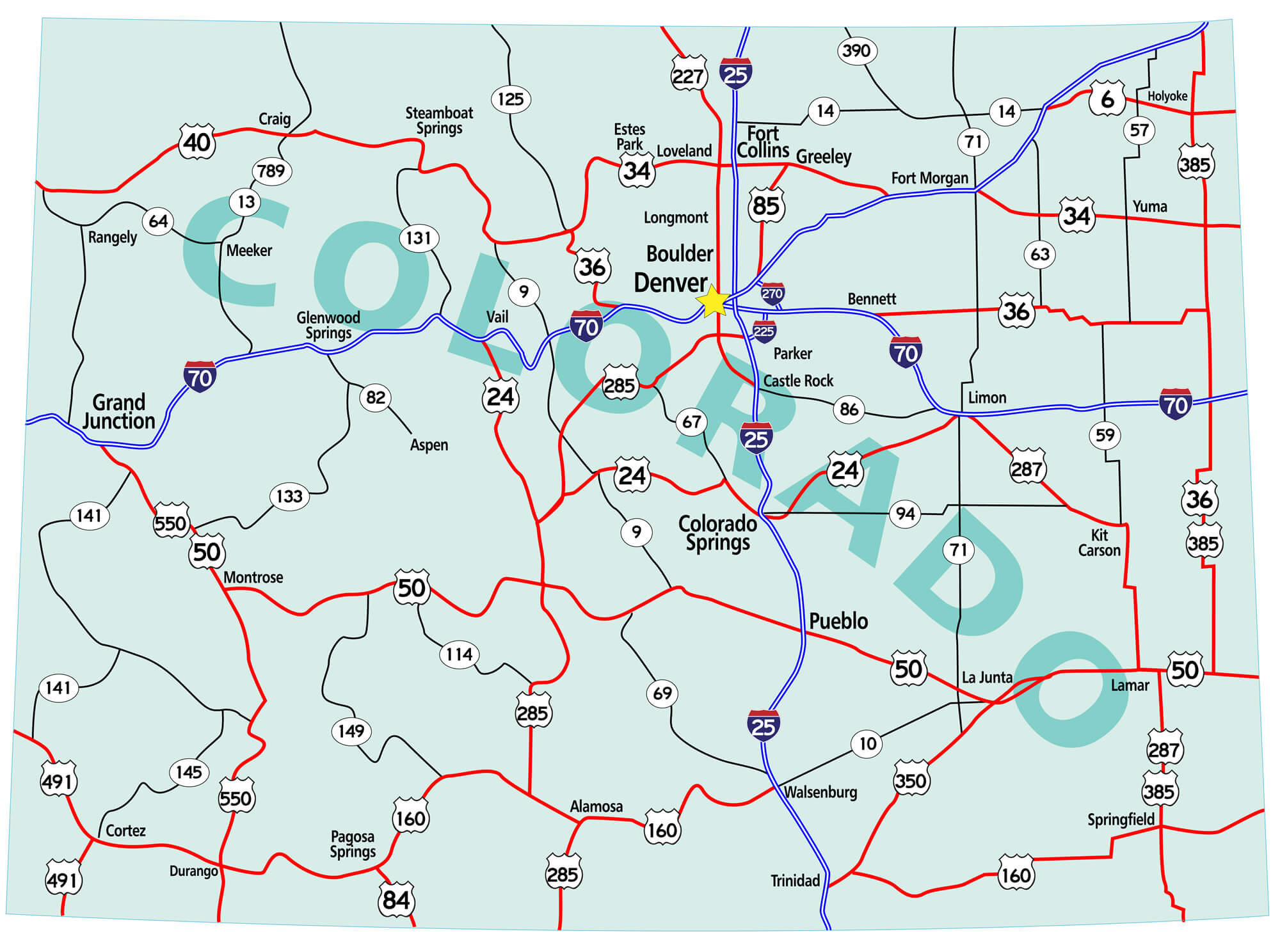 Colorado state road map with Interstates, U.S. Highways and state roads. Raster illustration.