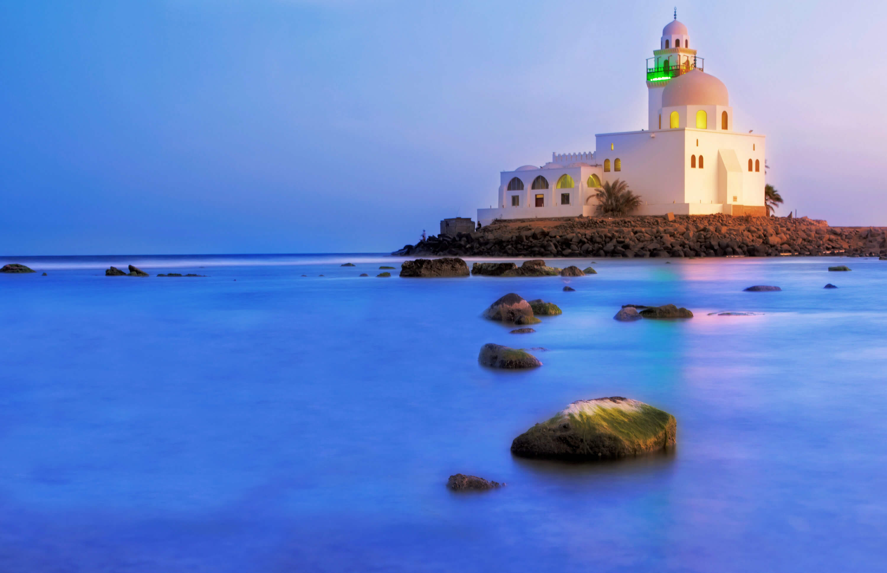 A floating mosque at Jeddah Corniche, Jeddah, Saudi Arabia. Picture taken during sunset.