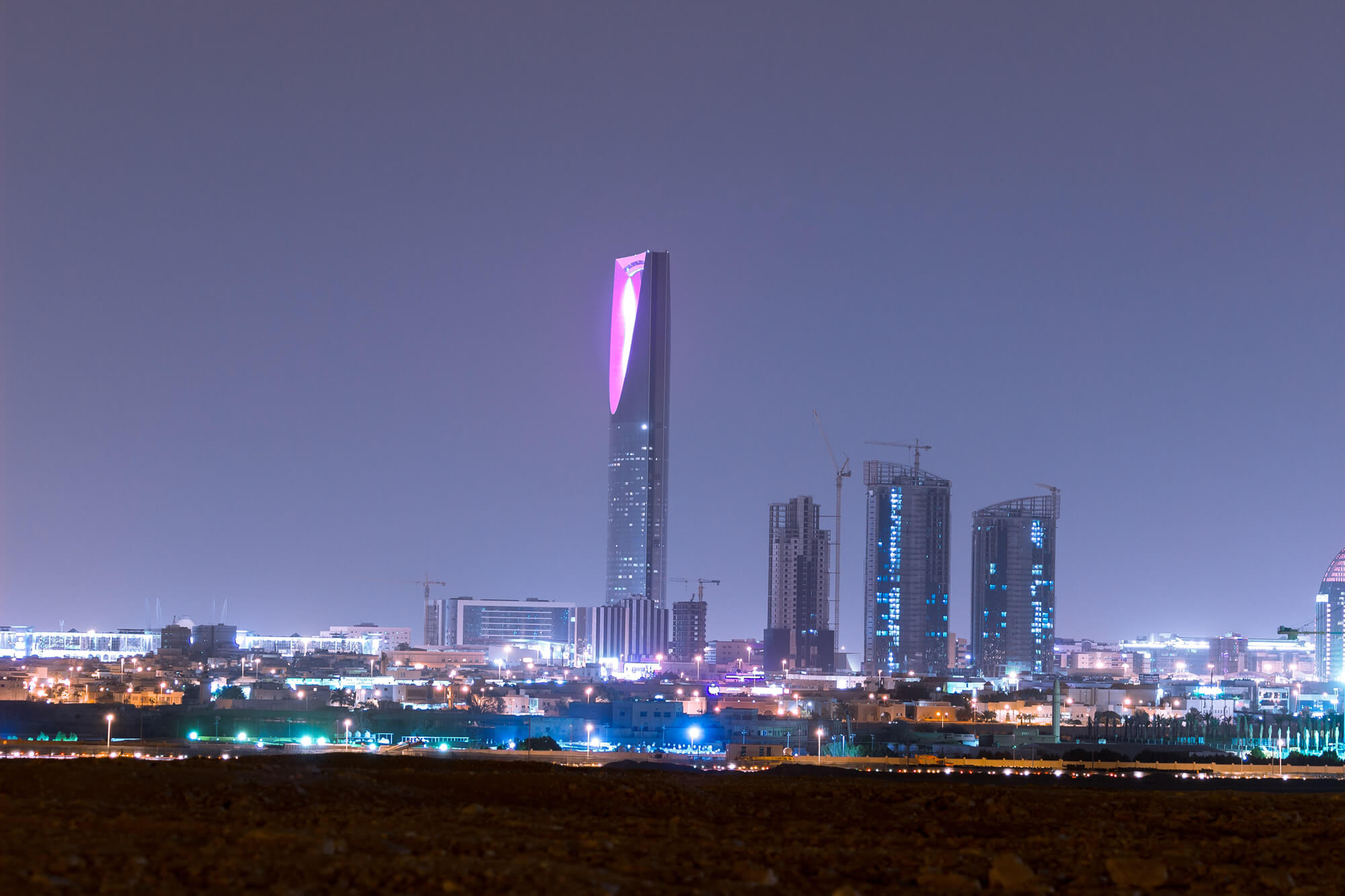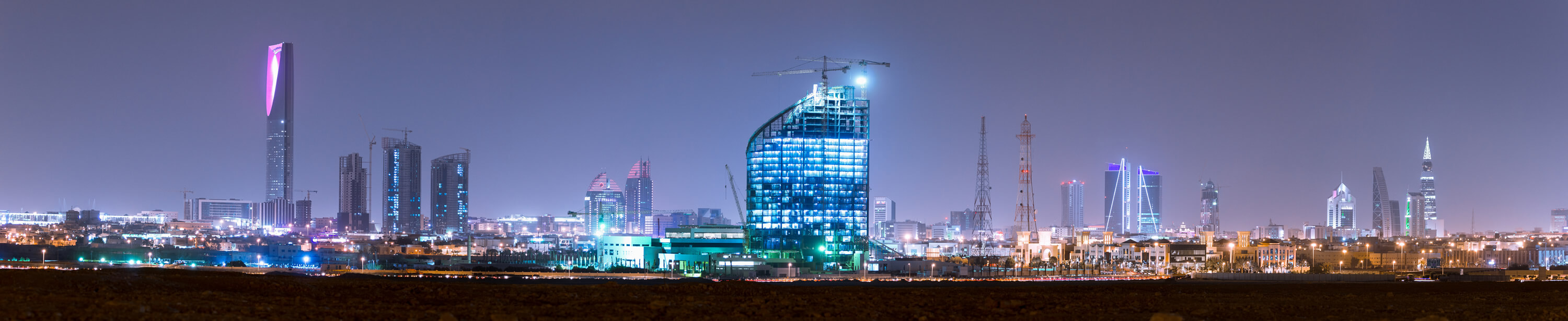 RIYADH, SAUDI ARABIA - OCTOBER 15, 2015: Outside distance skyline view on Riyadh Kingdom tower and other skyscrapers at night, part of full panorama.